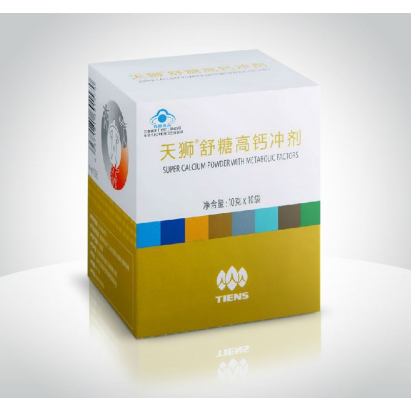 TIENS Super Calciu, pulbere cu Factori Metabolici este obtinut din componete naturale pure, nu contine sucroza si are un continut scazut de grasimi si calorii. 10 g (un pliculet) contin peste 360 mg de pulbere enzimolitica de calciu din oase. Acest produs contine ciclopropil aminoacid, factor de scadere a nivelului de zahar din sange, ce poate regla in mod eficace functia secretorie a pancreasului, poate stimula multiplicarea bifidobacteriilor din tractul intestinal, mentine functiile normale ale tractului intestinal si intari imunitatea. In plus, contine 18 aminoacizi, colagen, fosfoproteina, minerale si vitamine. Au fost adaugate faina de dovleac si oligoraharide functionale pentru a proteja pancreasul, a suplimenta cantitatea de calciu, a reduce nivelul de zahar din sange, a echilibra nutritia si a preveni cnmplicatiile diabetice.