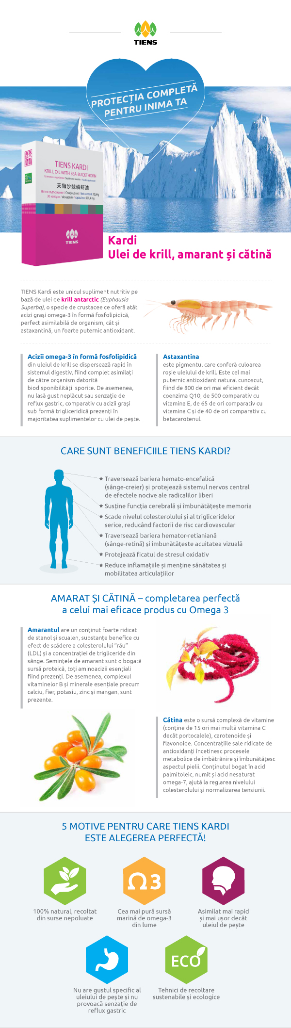 TIENS Kardi este o sursă naturală și completă de acizi grași omega-3: EPA și DHA cu extract de Ginkgo Biloba bogat în flavonoide, fără a lăsa gustul neplăcut sau senzația de reflux gastric specifice produselor similare. Krilli sunt recoltati din Oceanul Antarctic, este locul cu cea mai curată apă a planetei. Totodată, krillul antarctic este considerat cea mai pură sursă de omega-3 de proveniență marină.